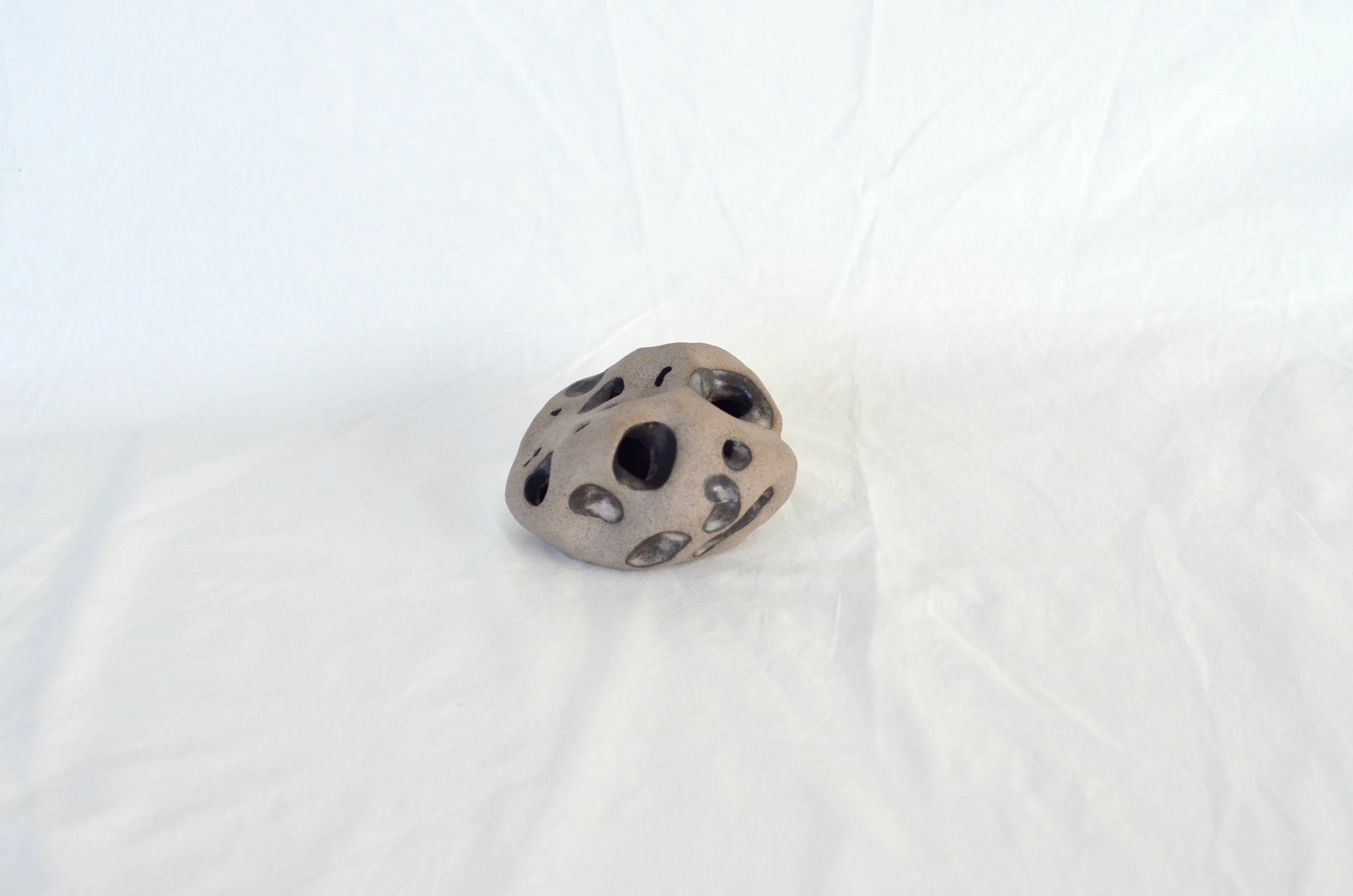 This small hole-filled ceramic stone was inspired by foraged beach rocks sculpted by coastal forces. Created from speckled grey stoneware clay, it is glazed with a dappled matte grey in the indentations of the holes. The piece has a unique shape and arrangement of holes, just like those found in nature.